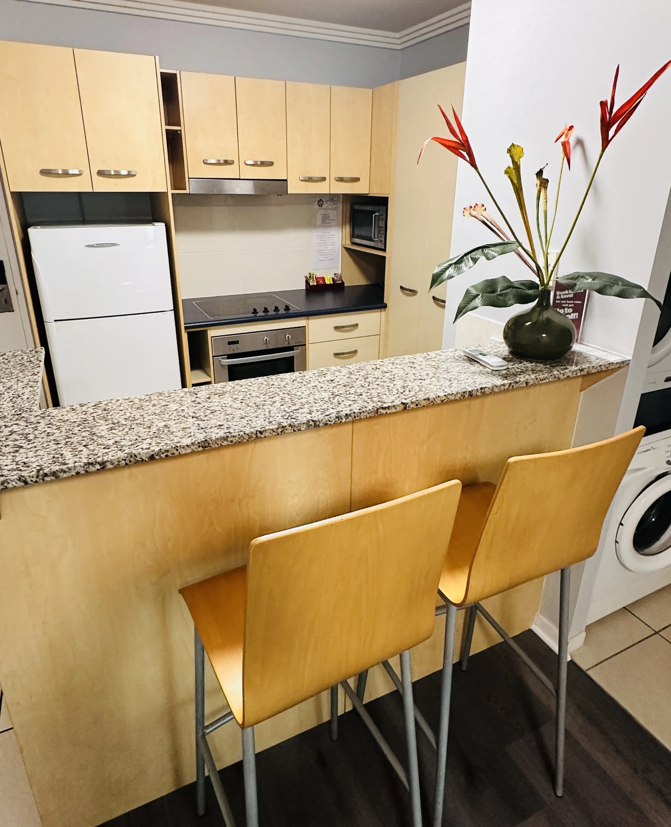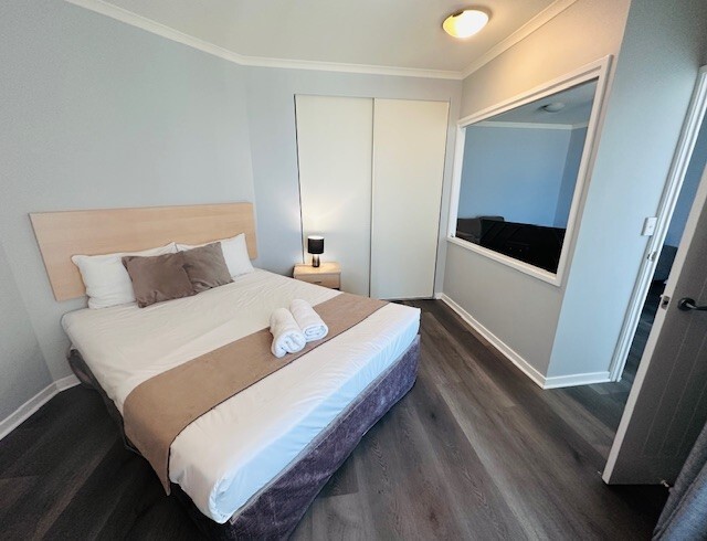 This Apartment offers a breath of fresh air with it's fresh coat of paint, stunning new floors and spacious new furniture layout. This modern apartment boasts a spacious living and dining area, a large entertainer balcony, a fully equipped kitchen and laundry, and all the cosy comforts to make your stay homier (tea and coffee, linen, iron, hairdryer, spacious wardrobe).