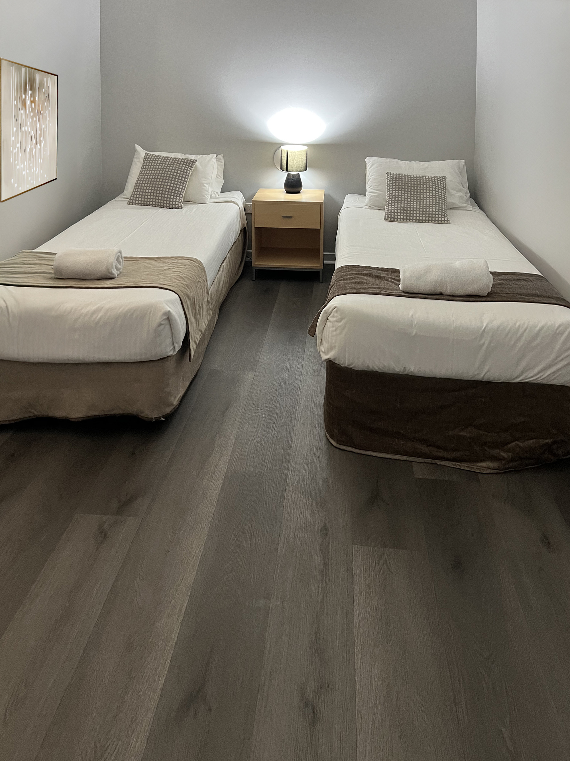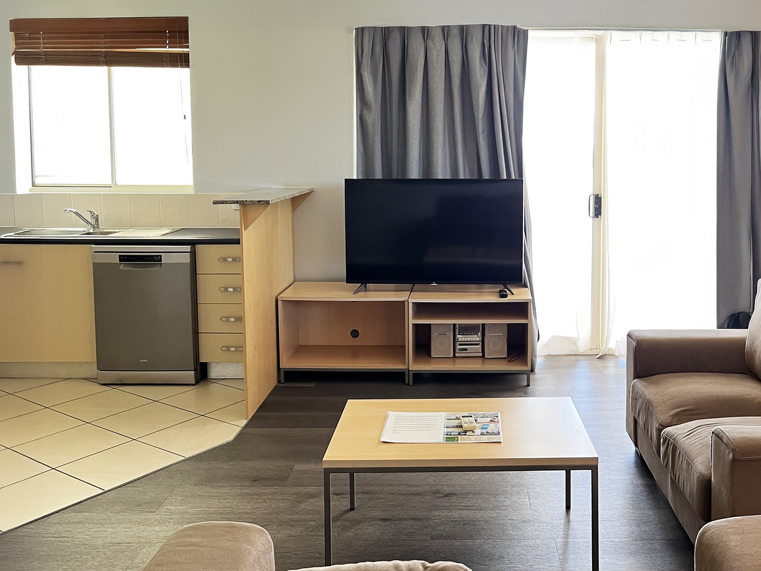Our recently renovated two-bedroom apartments accommodate up to four guests. This Apartment is a breath of fresh air with it's fresh coat of paint, stunning new floors and spacious new furniture layout. This modern apartment boasts a spacious living and dining area, a large entertainer balcony, a fully equipped kitchen and laundry, and all the cosy comforts to make your stay homier (tea and coffee, linen, iron, hairdryer, spacious wardrobe). The bedrooms have one queen bed and 2 x single beds to cosy up in during your stay.